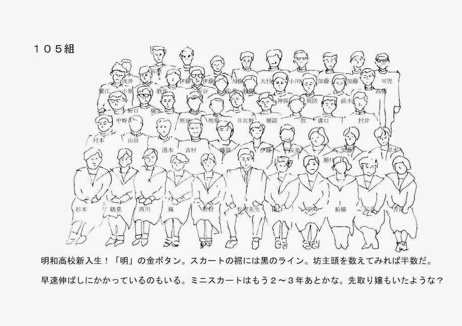 私の1年の担任をされた古文・27歳の松原先生(86歳)が出席され、「おお、高橋君」と私を、凸と同様に覚えていたのに驚きました。松原先生は306組の担任でもあり、卒業アルバムと共にクラス306の輪は確実なのですが、105組の私の成績は中庸であり、よっぽど古文ワルだったのか、剣道部に入り声が単に大きかったのか。それで、105組のクラス写真(上掲)をスマホで示してみたのですが、308組の野口は覚えていませんでした。私は嬉しかったです。