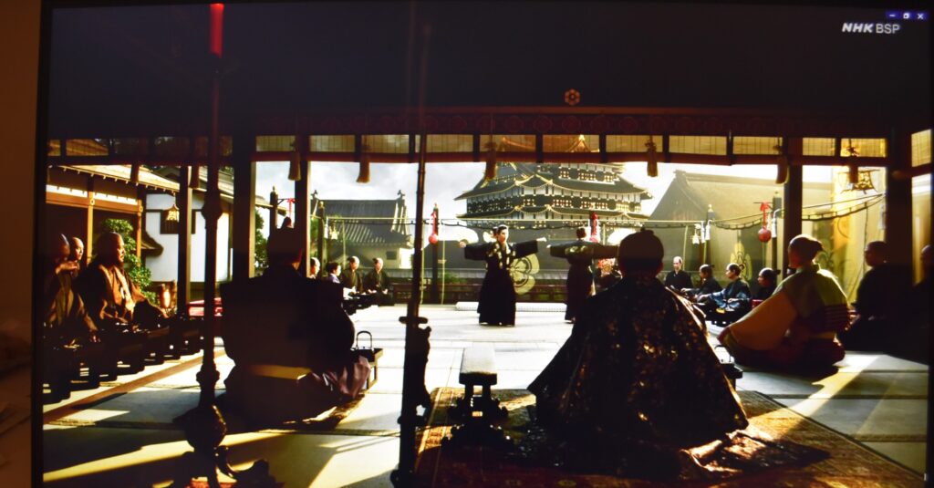 少年に踊りを板の間でさせて、座敷から見るシーンですが、その向こうに多門櫓、御幸御殿の屋根、金ぴか天主を見せ、信長の権力を示す事にNHK美術の構想力を感じました。内藤復元の天主2階(穴倉を1階とすると、天主3階)こそ、こういう場合の舞台付きの宴会場ですし、それ以外にも伝・二の丸、摠見寺にも座敷はあるのですが、この舞台設定は伝・三の丸に座敷があったことを示しています。
