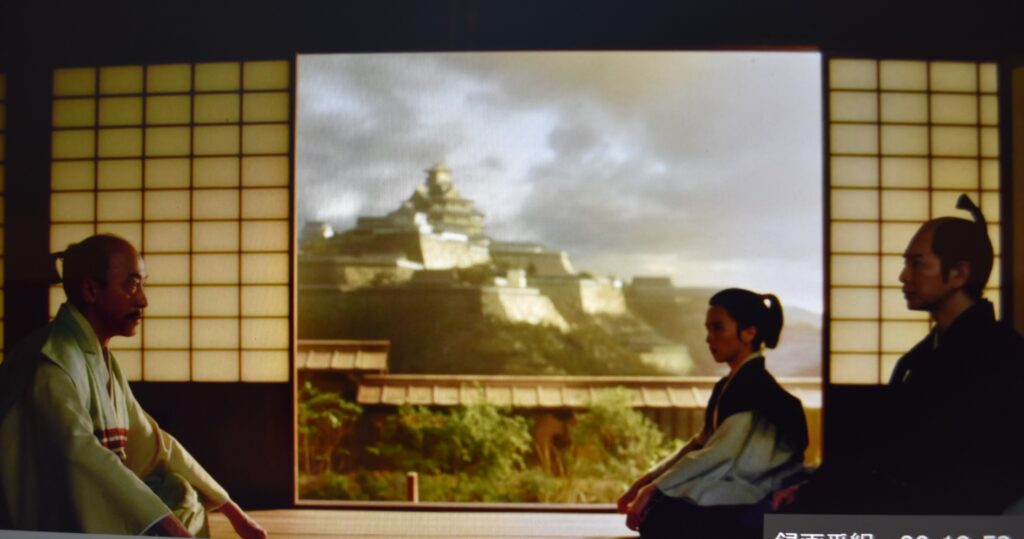 城下の明智光秀の屋敷を家康が訪ねるシーンです。この座敷はセミナリヨのある内湖にあることになります。安土山の西北の湖を埋め立てて配下の屋敷を作られているので、山の上には安土城天主でなく、摠見寺の伽藍が見えていたでしょう。この石垣は現地にある石垣の5倍の高さがあります。嘘です。信長は守り堅固な城郭を作ったのでなく、権力をしめす王宮を伽藍と共につくり、蓬莱山をめざしたのでした。信長の安土城の建設意図を捻じ曲げた背景です。