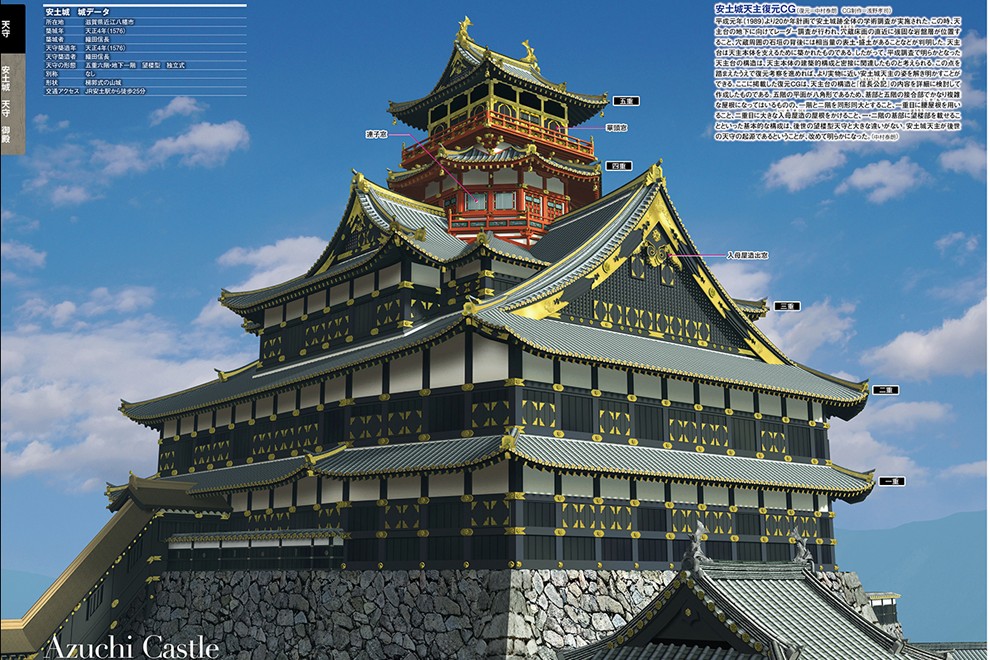 信長の安土城天主復元CG (復元=天守:中村泰朗、その他:三浦正幸 CG制作=浅野孝司)。平成元年1989年からの滋賀県の平成学術調査および『信長公記』の内容を検討して作成されたもの。本書では、安土城は御殿を含む全景の鳥瞰復元CGも掲載。折込A3の大きさで、ノドに邪魔されず、細部までしっかり見ることができる。((株)Gakkenn 公式ブログ より)