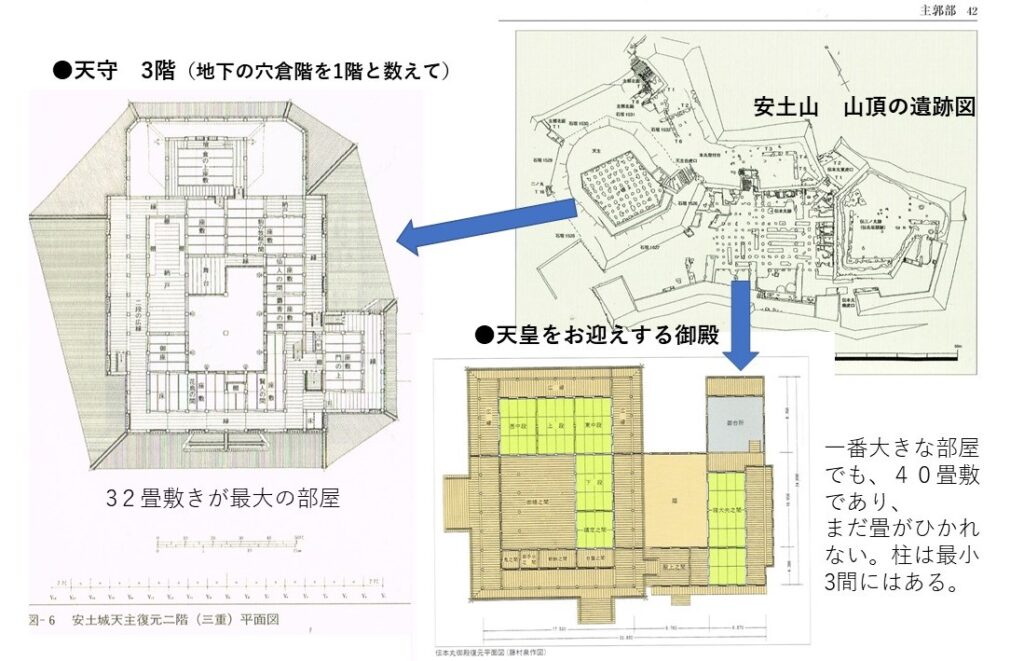 「これまで、多くの研究者が様々な天主復元案を発表されていますが、いずれも復元の根拠となる資料として決定的な案として確定したものはなくとして決定的な案として確定したものはなく、安土城の実像はいまだ謎につつまれており、「幻の城」といえる状況です。」