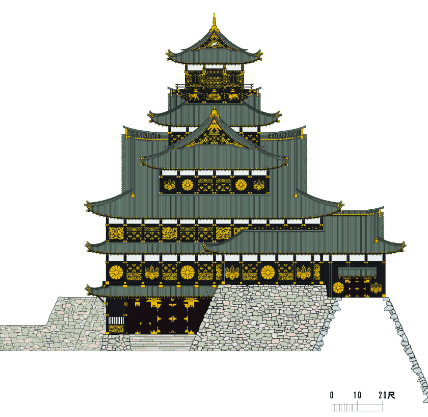 2008年の三浦・佐藤案とどこをどうして変えたなど意味のない詮索です。安土城復元案と同様に派手に外壁に金をまとっています。