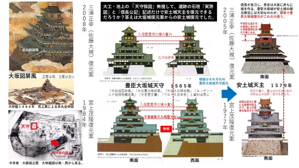 内藤先生は、著作「復元安土城」で「信長公記」と「天守指図」と「八角の石垣」の一致を明らかにしました。宮上氏のいう「天主指図は大工の妄想」ではなく、史実としてあった安土城天主の姿が、拝見記「信長公記」と大工の「天守指図」と別々の方法で残されていたとするのが、科学する学問「復元的研究」の結果です。三浦氏、その他のイラストレーター諸氏の妄想の復元とは全く違うものです。