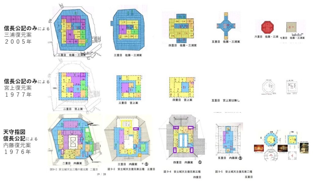 イラストレーターの復元は、このような「復元的研究」でなく、トレーサビリティ(追跡可能性)が必要などとは全く考えていません。「信長公記からの復元」と言い、平面図を書いて解説しているのは半世紀前の宮上氏だけであり、20年前の「城のつくり方図典」三浦案(佐藤案)は、イラストレーターの復元の類です。5年前に中村案と名を変え、なぜか形も変えた(三浦伝統建築文化研究室で見えます。)のですが、「安土城復元研究の過去・現在・未来」では、平面図から柱を抜き取られており、さらに「建築」とはなっていません。
