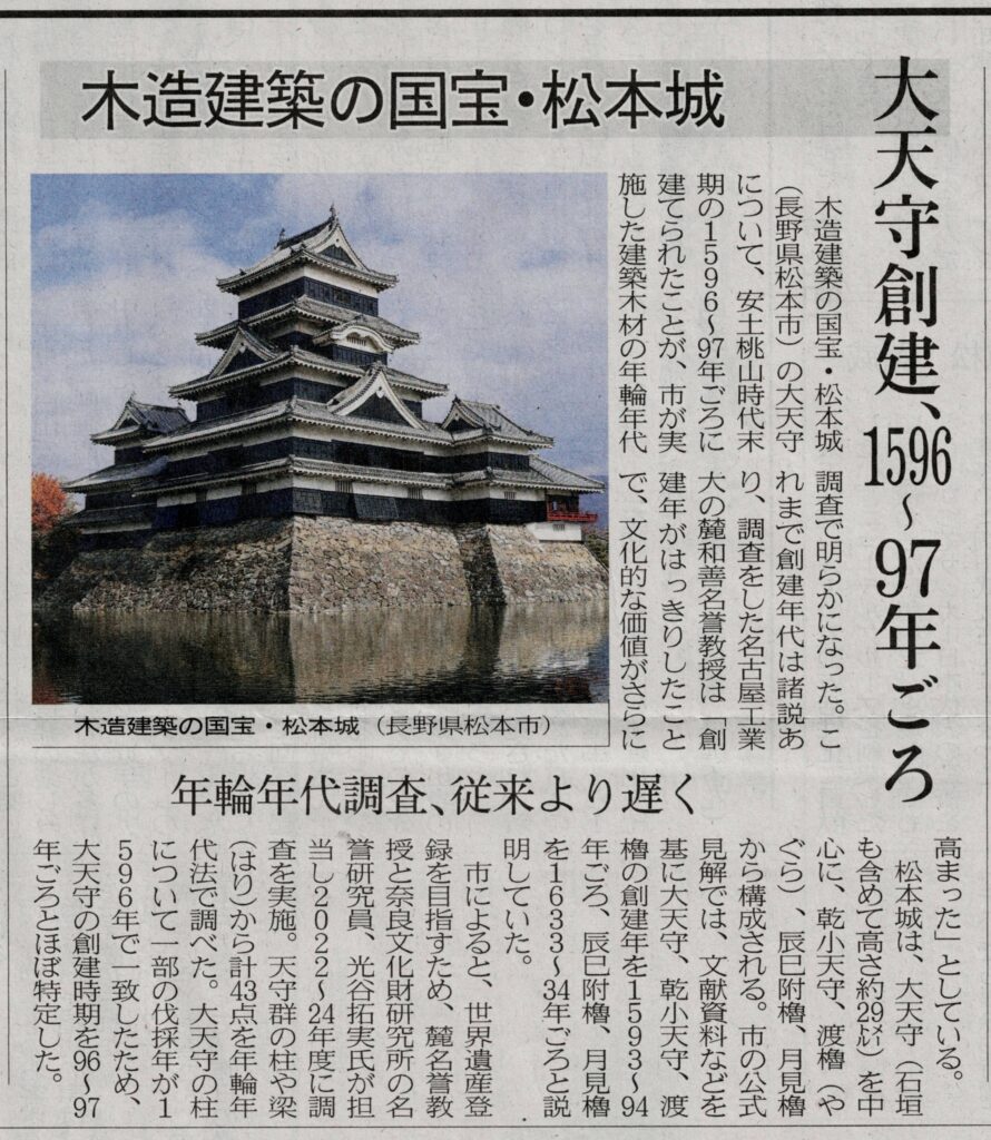 犬山城天守の建築木材の年輪年代調査のコンビ、奈良文化財研究所の光谷拓実名誉研究員、名古屋工業大学の麓和善名誉教授が、「一部の伐採年が1965年で一致した。公式見解では創建を1593~94ごろと説明していたが、1596~97年ごろとほぼ特定した。」とありました。